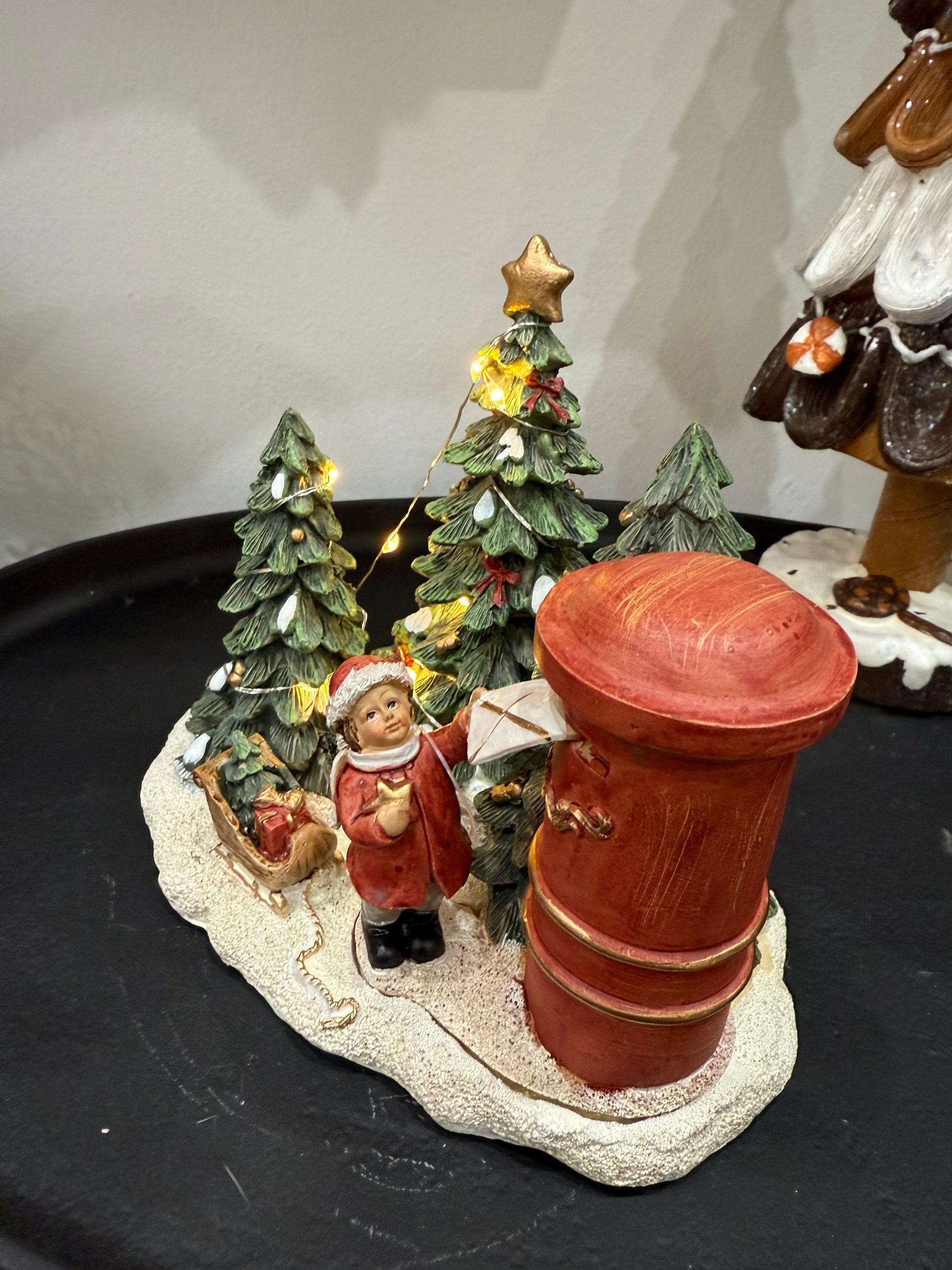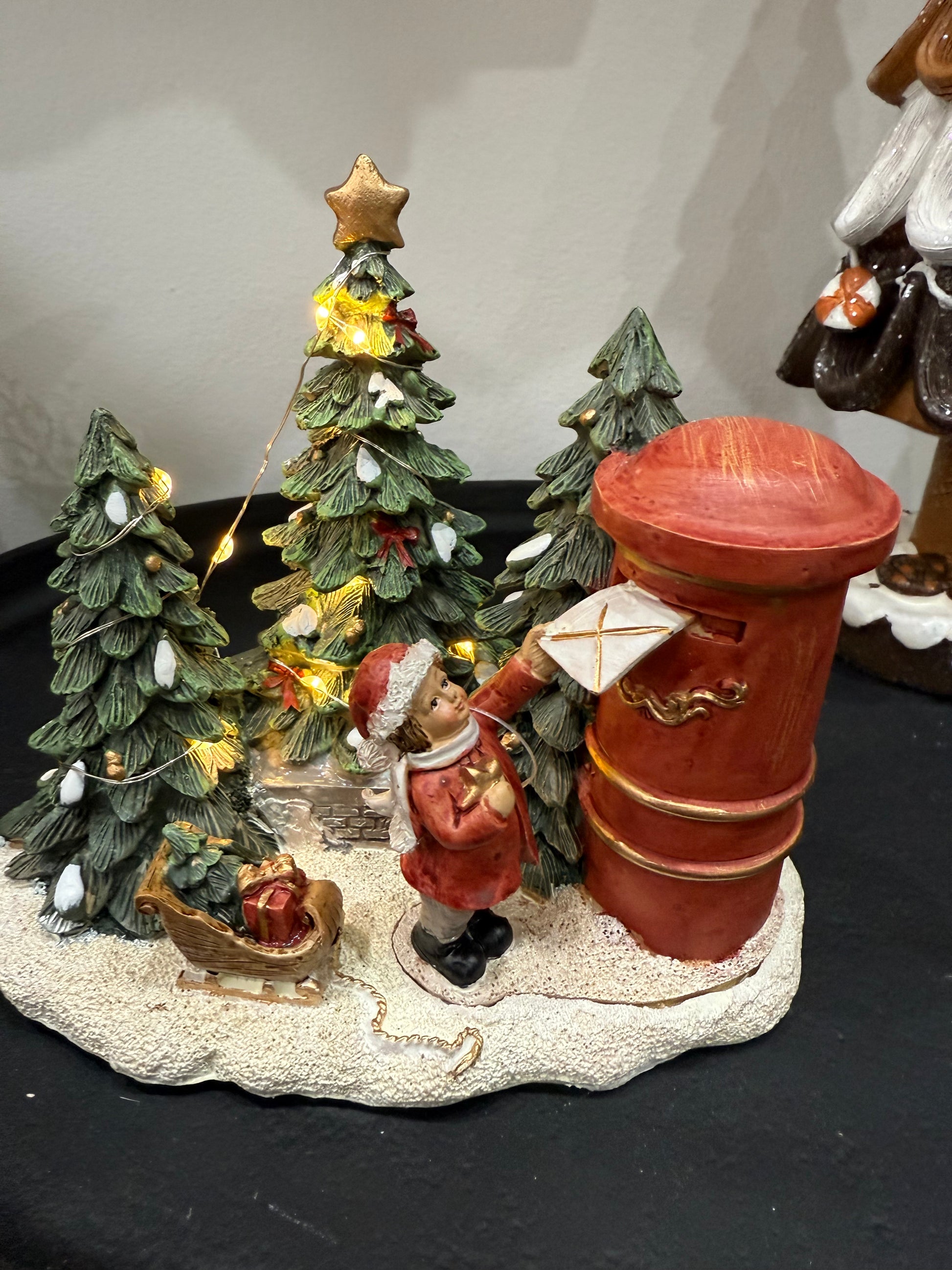 Zauberhafte Weihnachtsdekoration mit warmem LED-Licht – ein Kind wirft seinen Wunschbrief in den roten Briefkasten, umgeben von festlich geschmückten Tannenbäumen.