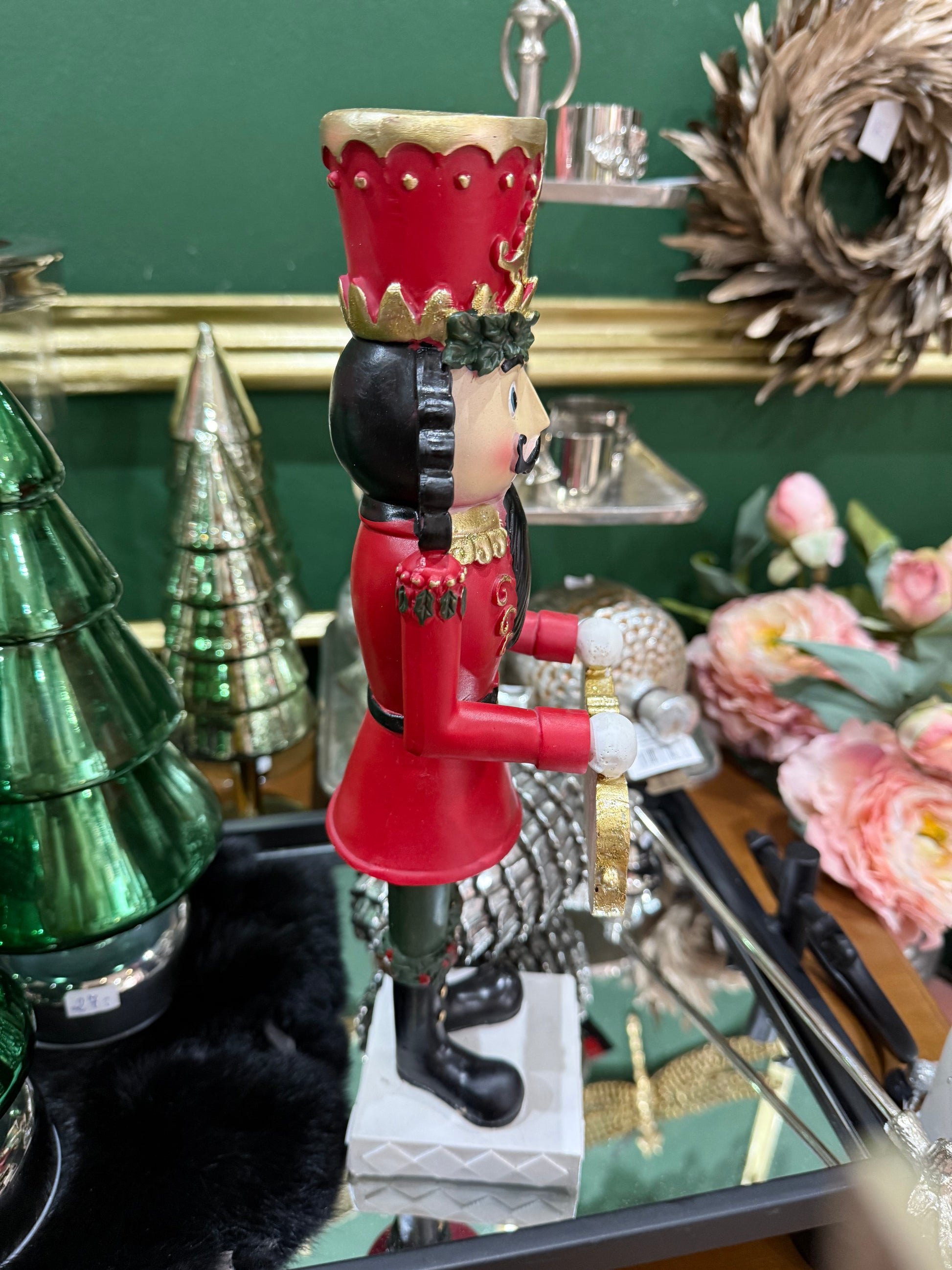 Wunderschöne Weihnachtsfigur Nussknacker in festlichem Rot und Gold, detailreich gestaltet und mit einem Schild „Merry Christmas“.