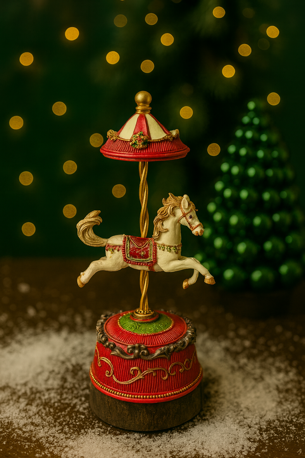 Wunderschöne, detailreiche Spieluhr mit einem edlen Karussellpferd. Beim Aufziehen erklingt eine zarte Melodie, die sofort festliche Stimmung verbreitet. Ein echtes Highlight für Ihre Weihnachtsdekoration oder als besonderes Geschenk.