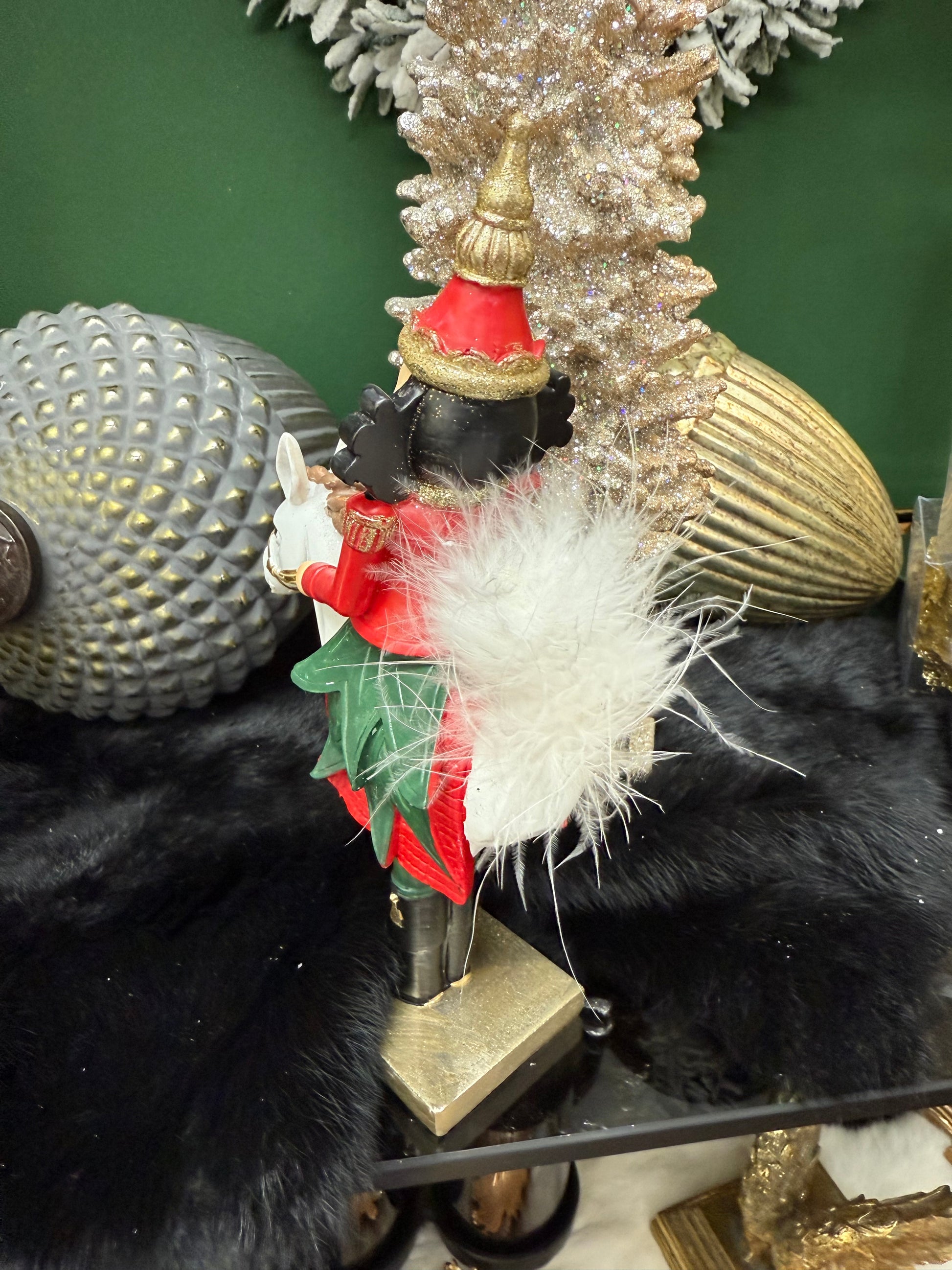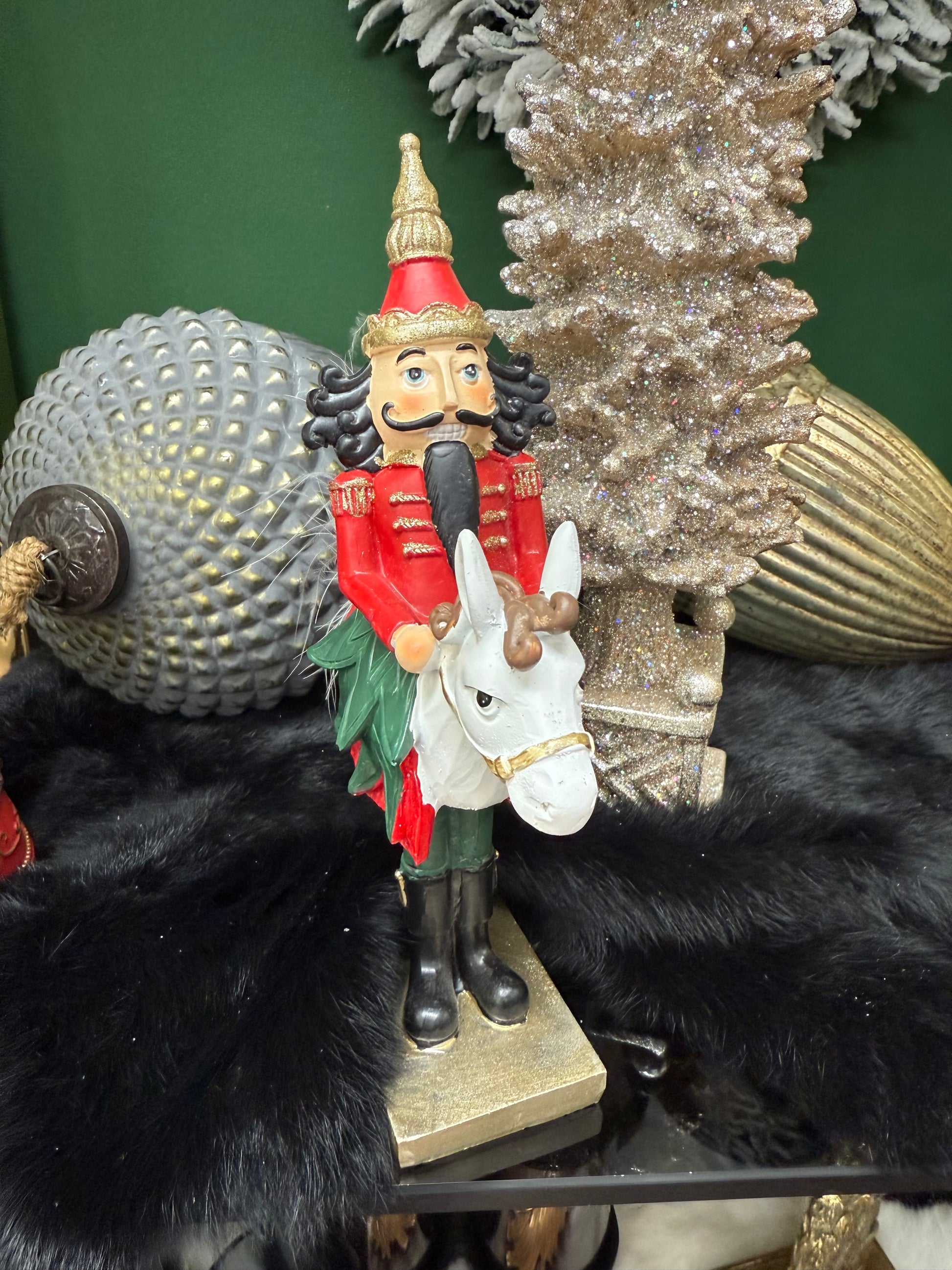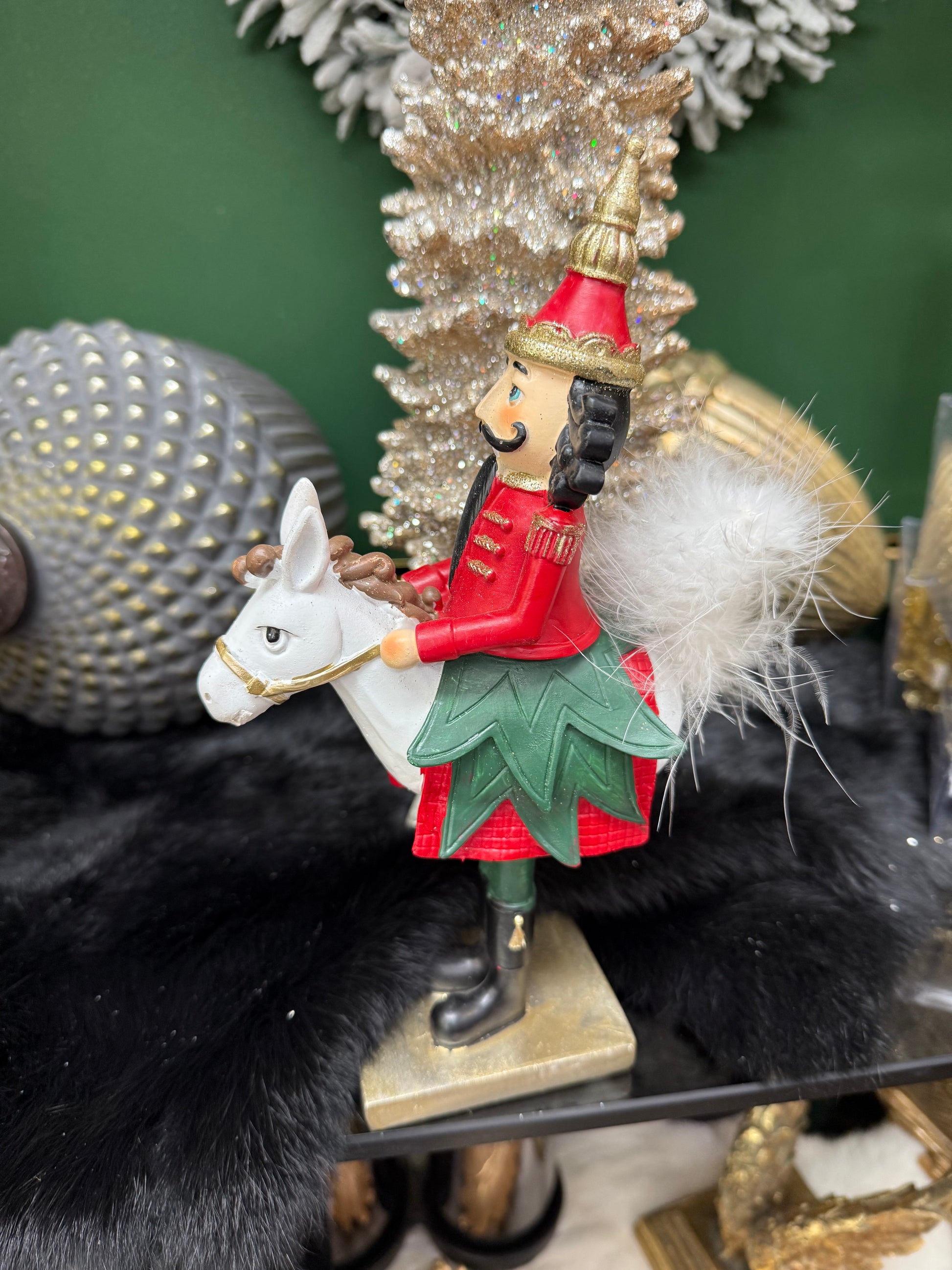 Wunderschöne, detailreiche Nussknacker-Figur auf einem weißen Pferd. Der Nussknacker trägt eine festliche Uniform in Rot, Grün und Gold und begeistert mit seinem traditionellen, weihnachtlichen Charme. Perfekt als elegante Dekoration für den Kamin, das Regal oder als Highlight in Ihrer Weihnachtsdekoration.
