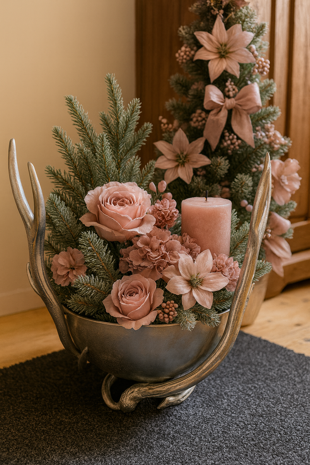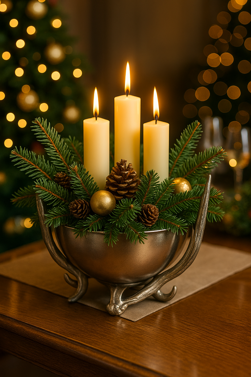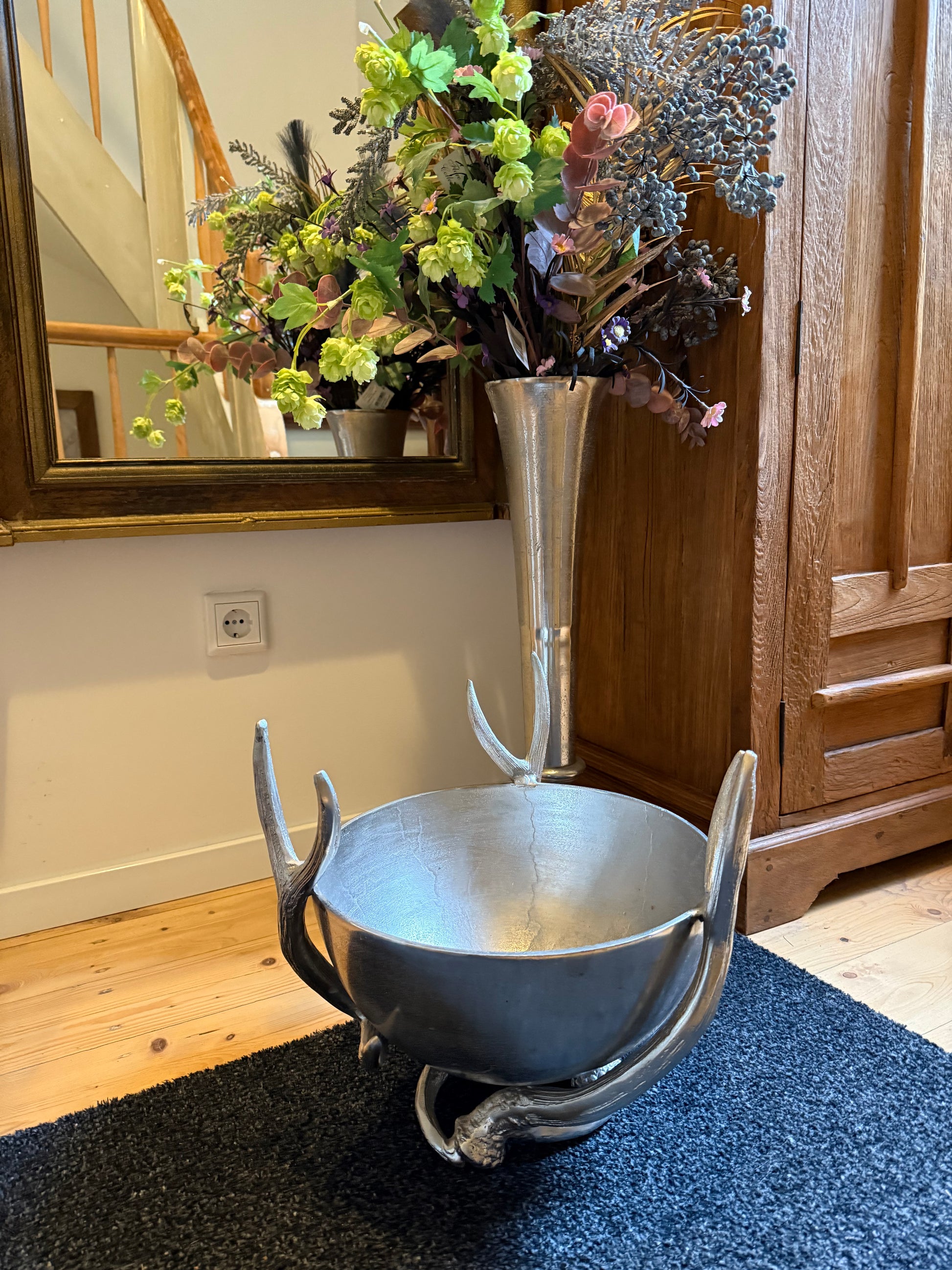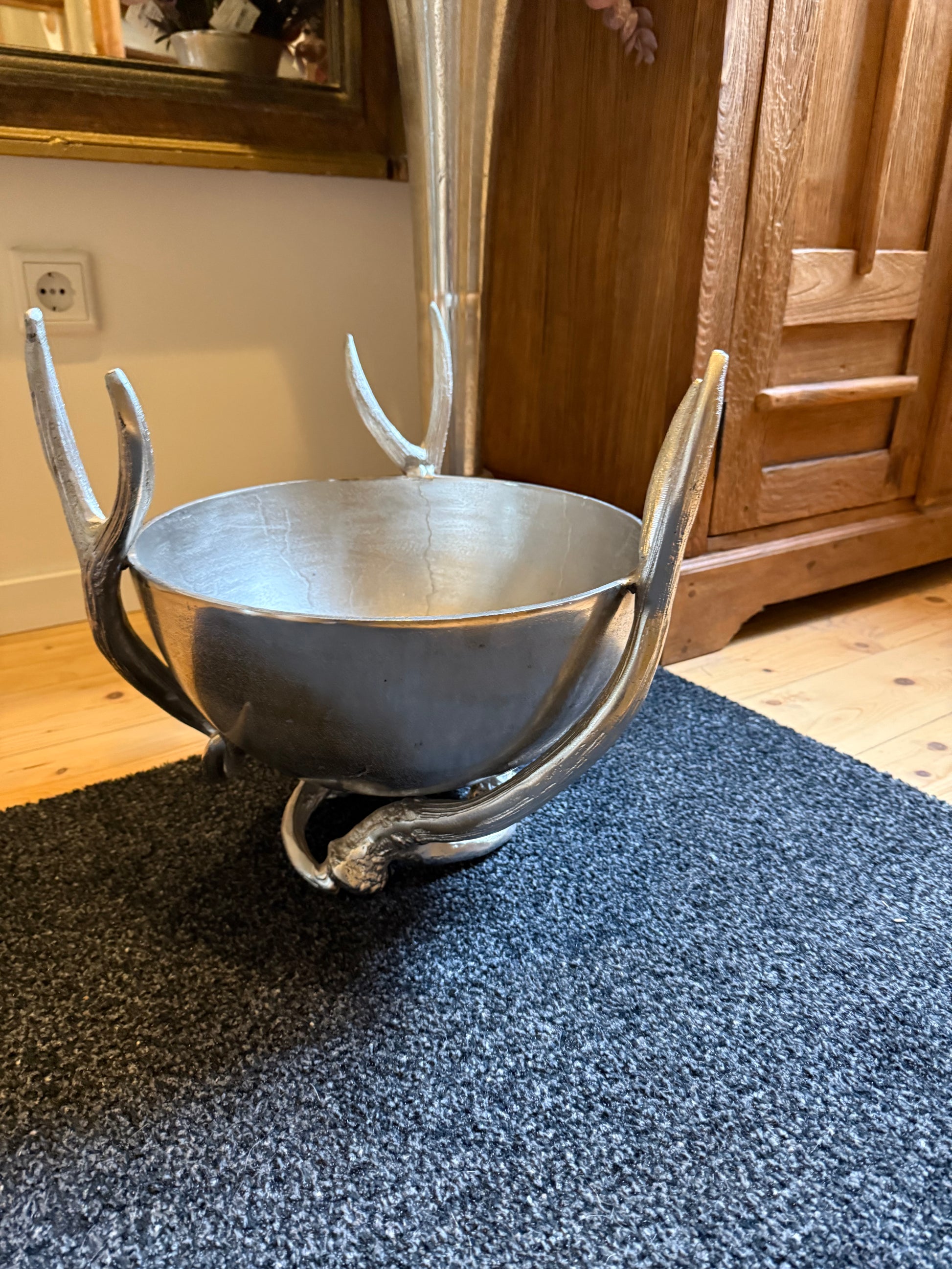 Wunderschöne, hochwertige Metallschale mit Geweihgriffen – perfekt geeignet als festliche Weihnachtsdekoration oder stilvolle Tischdekoration das ganze Jahr über.
