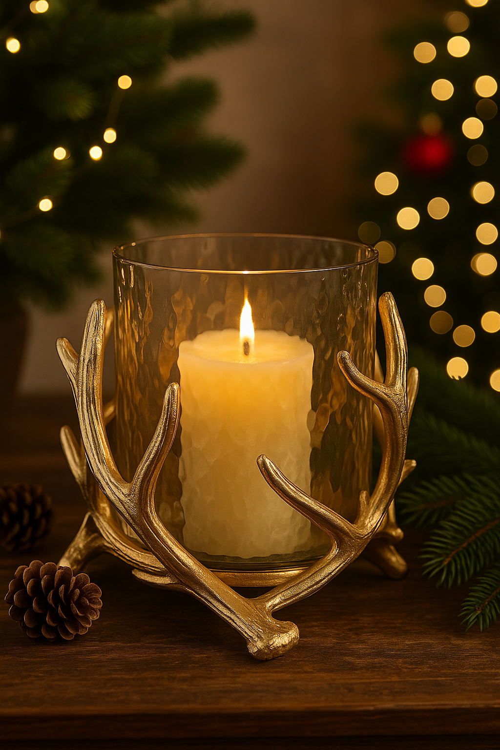 Dieser edle Kerzenhalter besteht aus hochwertigem, poliertem Metall in Goldoptik und einem strukturierten Glaszylinder. Die kunstvoll gestaltete Halterung erinnert an feine Geweihformen und verleiht der Dekoration einen luxuriösen, zugleich natürlichen Charakter.