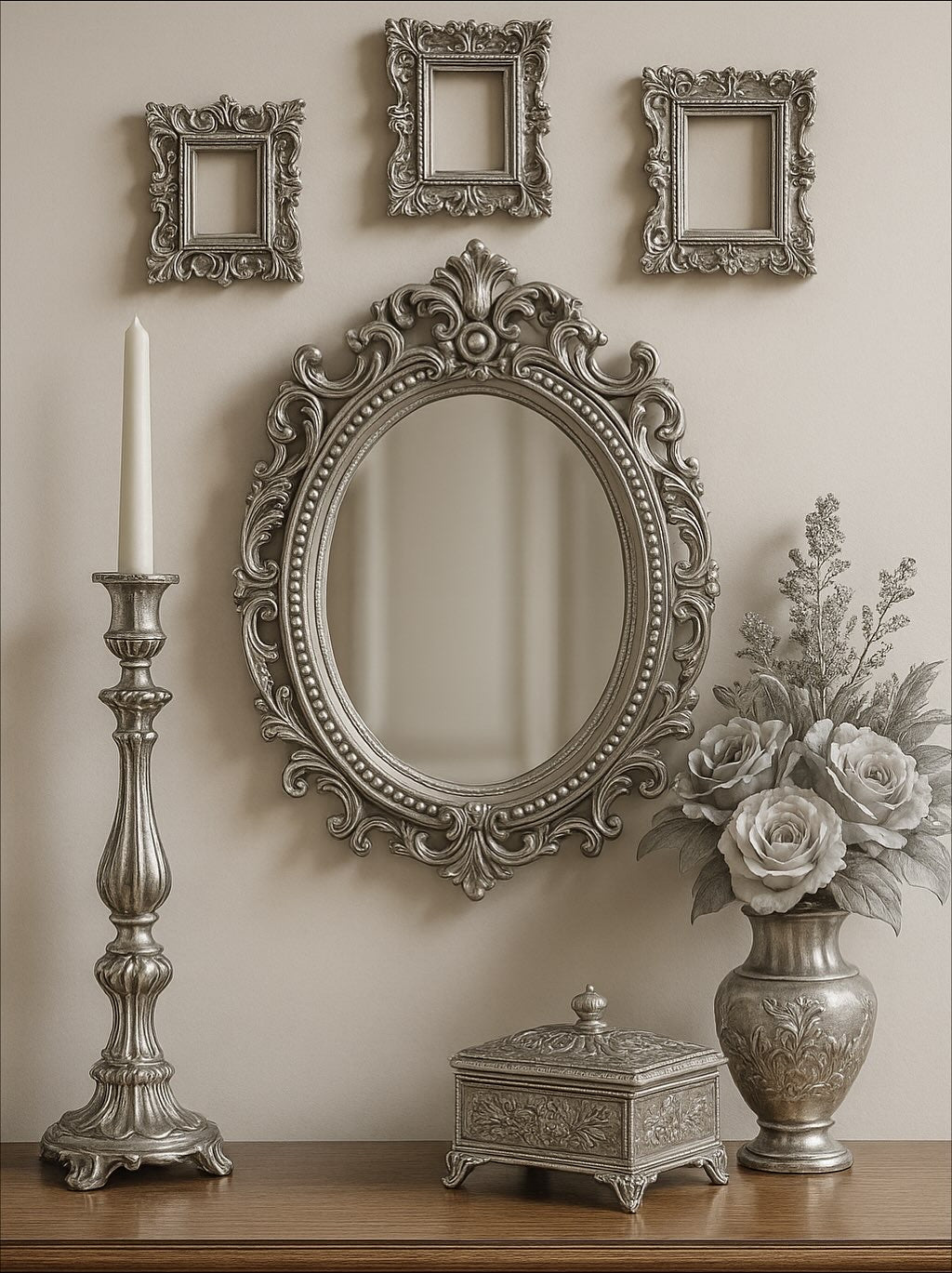 Wunderschöner ovaler Spiegel in dekorativem Rahmen im Farbton Antiksilber.