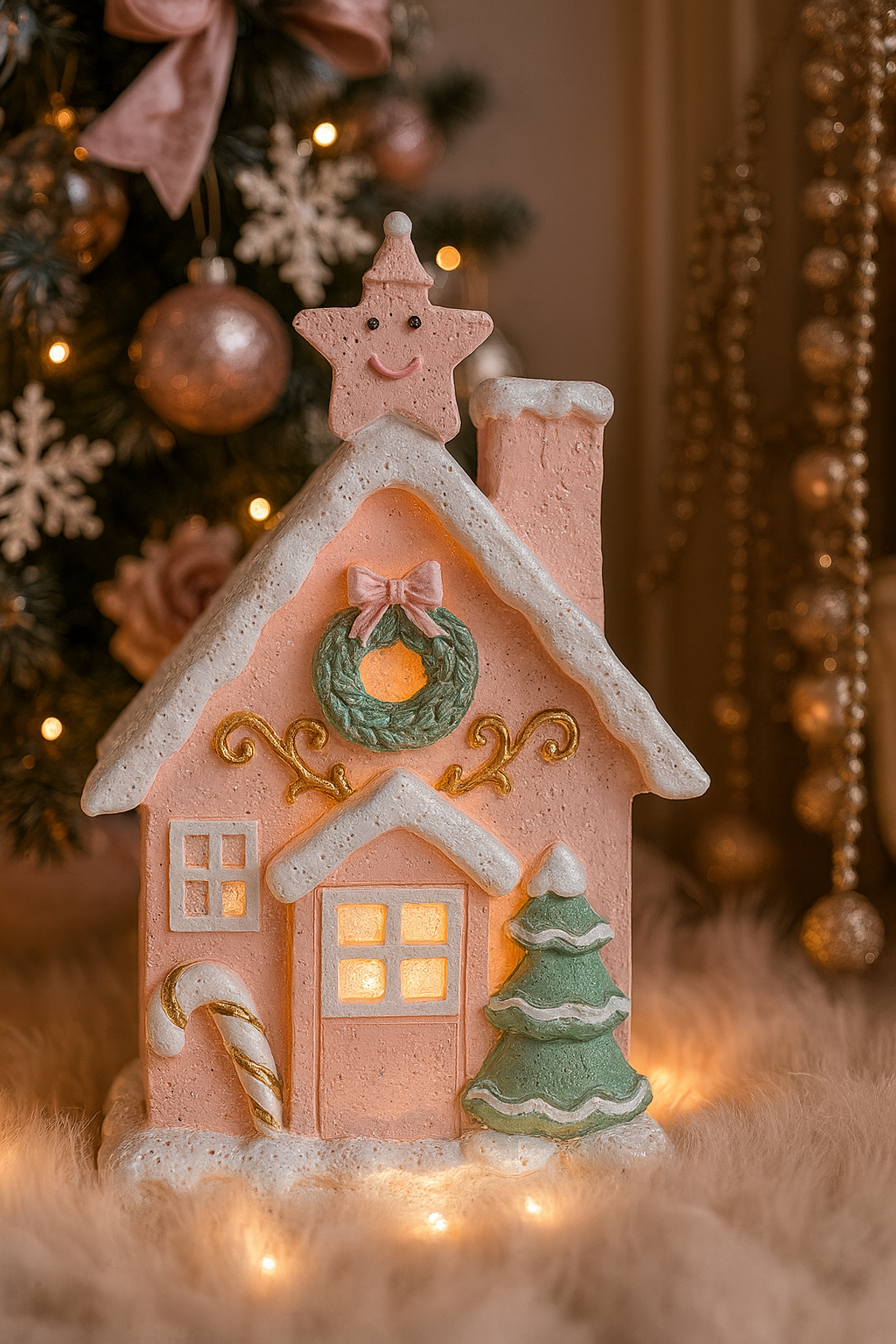 ✨ LED-Haus aus Polyresin – ein wunderschönes, rosafarbenes Weihnachts-Häuschen mit feinen Details, Kranz und Schneeeffekt. Das warme LED-Licht sorgt für eine gemütliche, festliche Stimmung – perfekt für elegante Weihnachtsdekorationen im Glamour- oder Shabby-Stil.