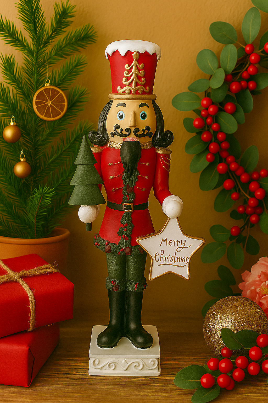 Wunderschöne Nussknacker-Dekoration in klassischem Rot-Gold, detailreich gestaltet mit Weihnachtsbaum und Stern mit der Aufschrift „Merry Christmas“.