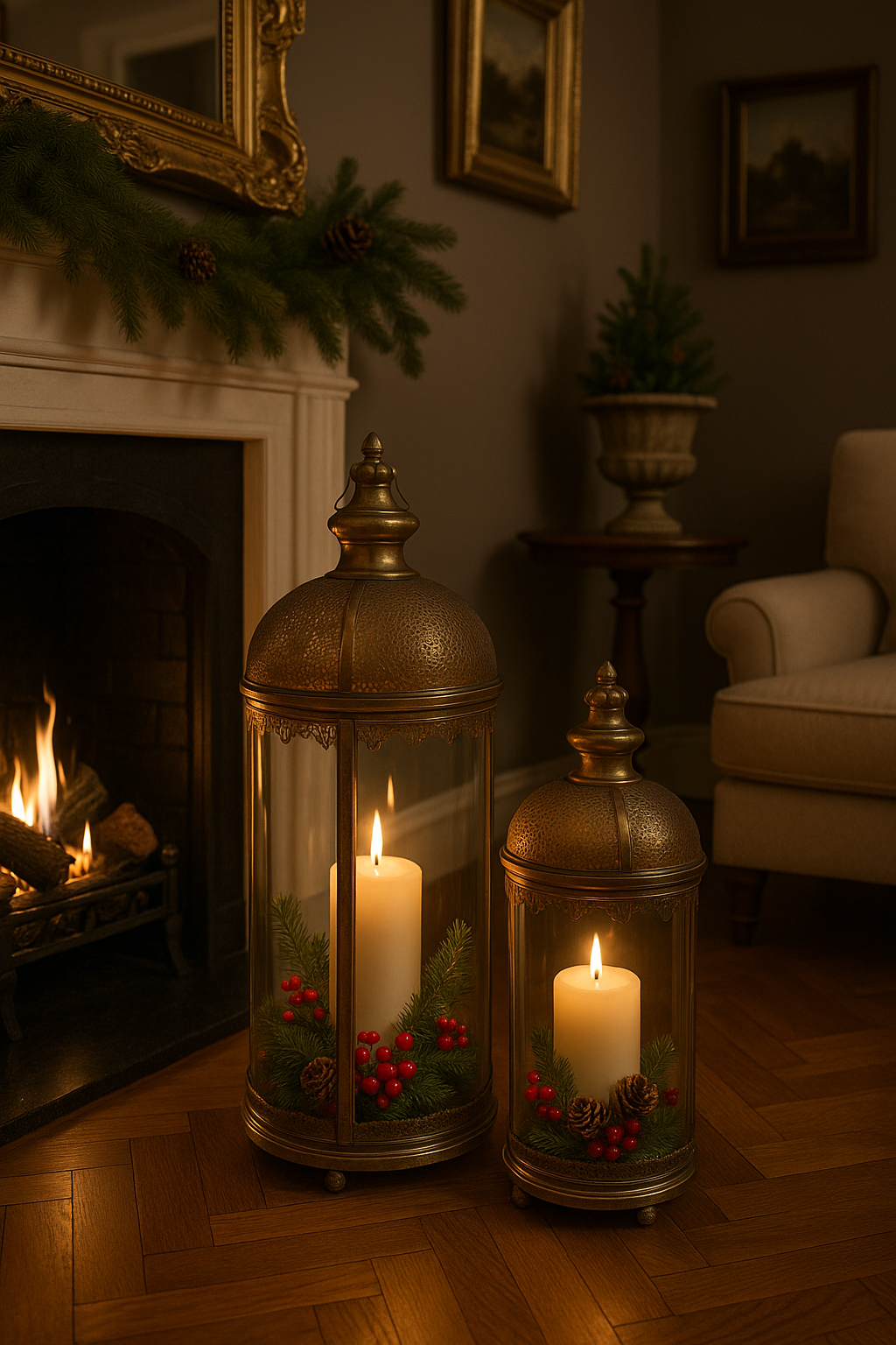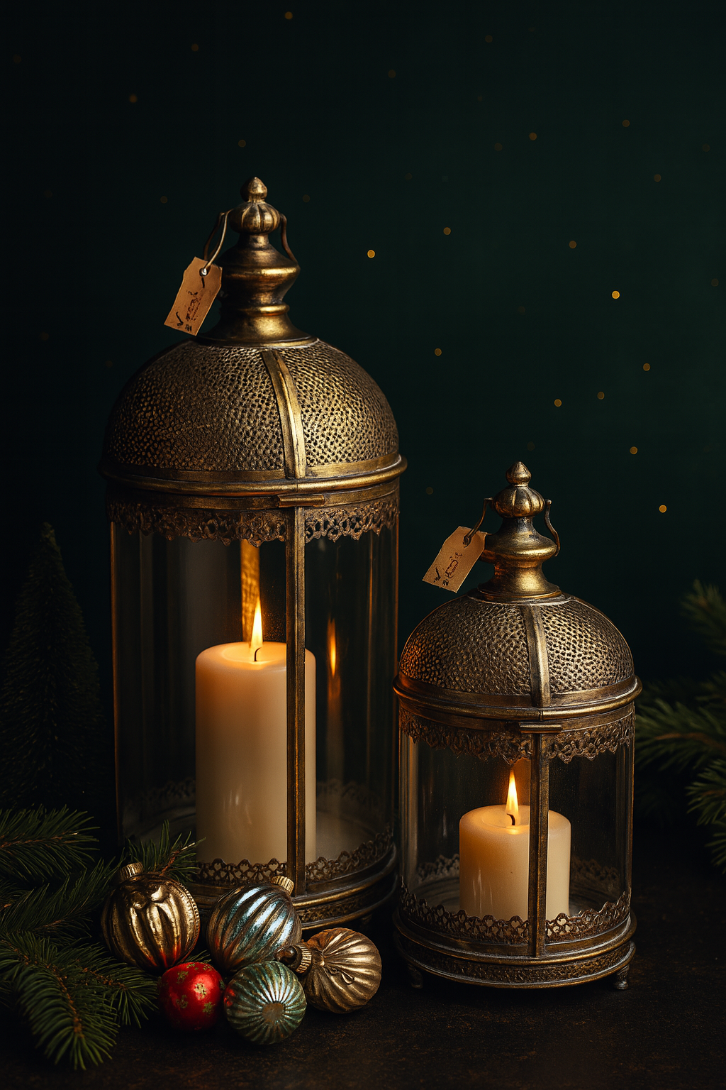 Exklusive Dekorationslaternen aus Metall im Farbton Antik-Gold mit verglasten Seiten. Wunderschön verziert im Vintage-Stil, bringen sie eine elegante und stimmungsvolle Atmosphäre in jedes Zuhause – perfekt für Wohnzimmer, Schlafzimmer oder festliche Arrangements.
