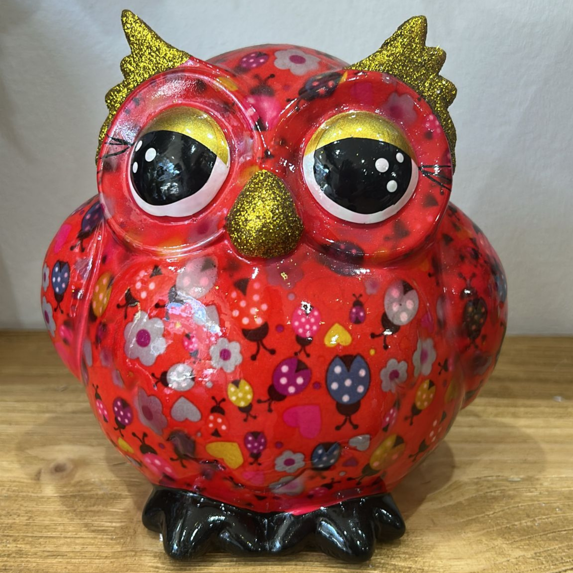 Wunderschöne, handgefertigte Spardose in Form einer fröhlichen Eule.
