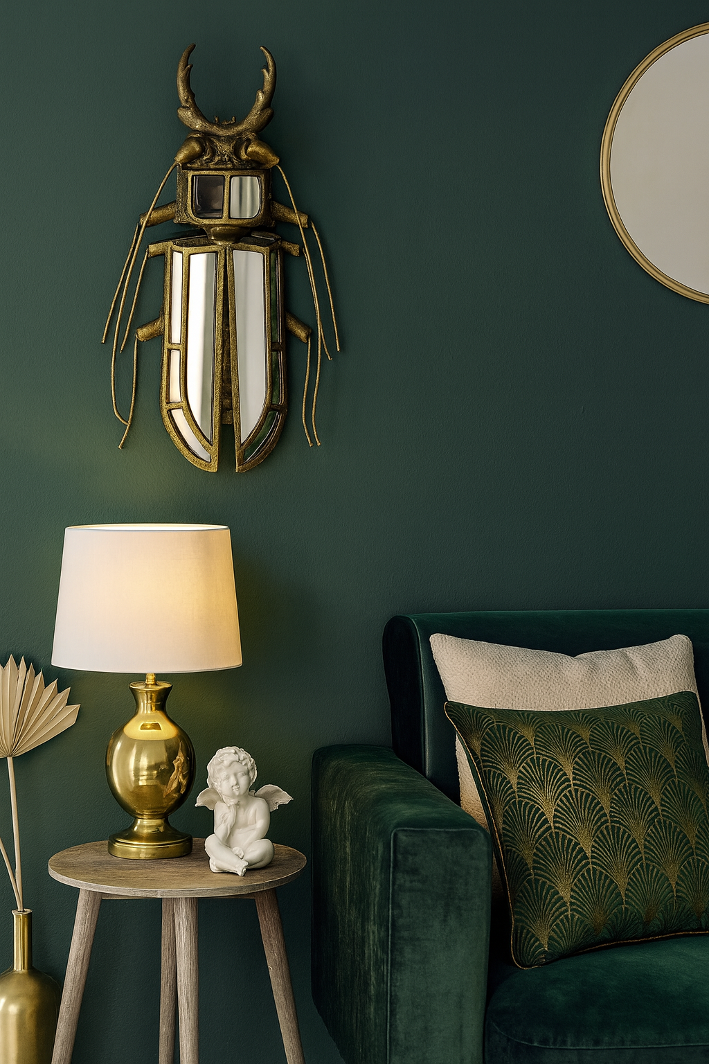 Ein außergewöhnliches Highlight für stilvolle Wohnräume: Diese Wanddekoration in Form eines goldfarbenen Käfers mit integrierten Spiegelelementen verbindet künstlerisches Design mit Eleganz. Perfekt geeignet für Wohnzimmer, Schlafzimmer oder Flur – ein echter Blickfang, der jedem Raum Charakter und Glamour verleiht.
