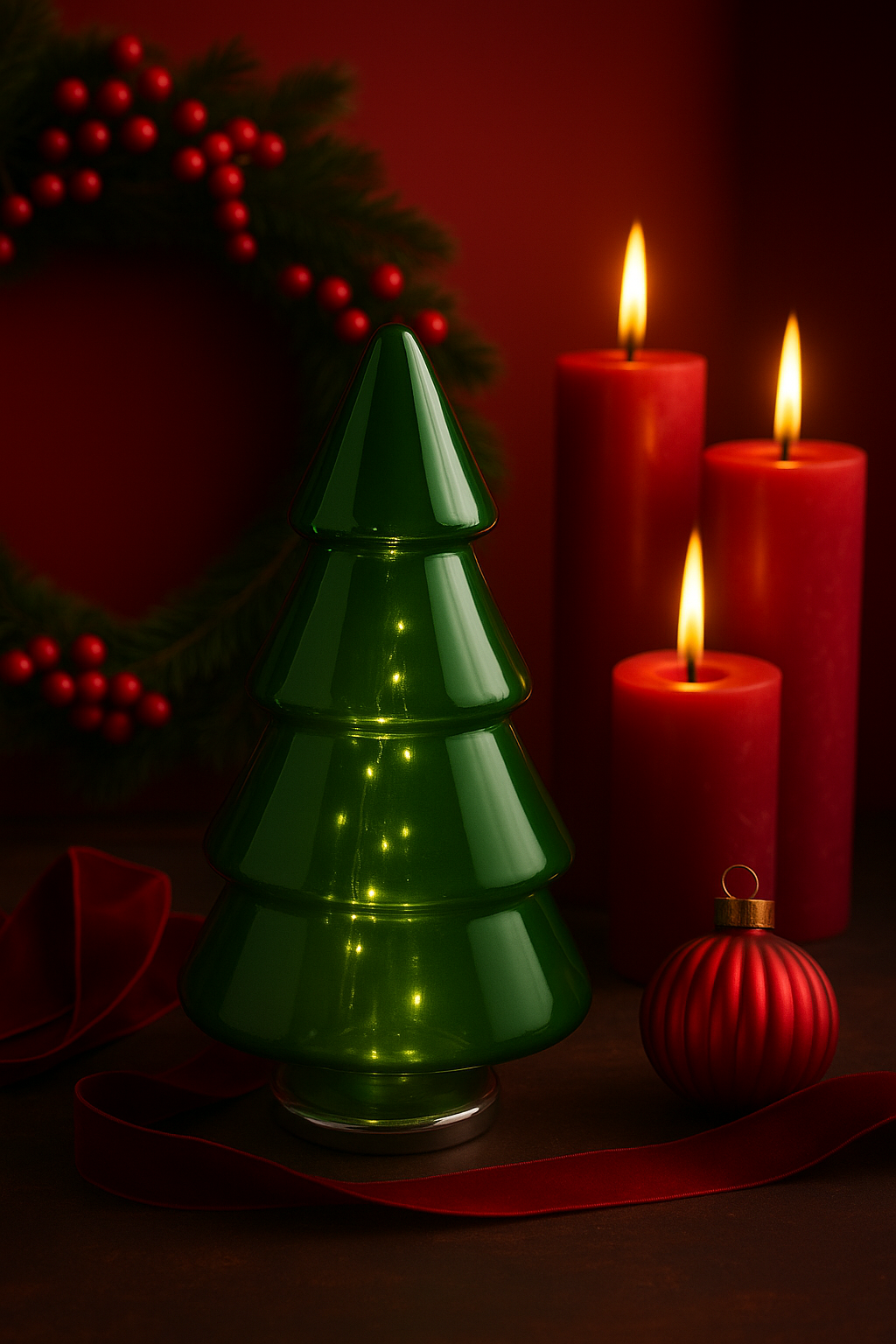Edle, gläserne Weihnachtsbaum-Deko in Flaschengrün, mit integriertem LED-Licht (batteriebetrieben).